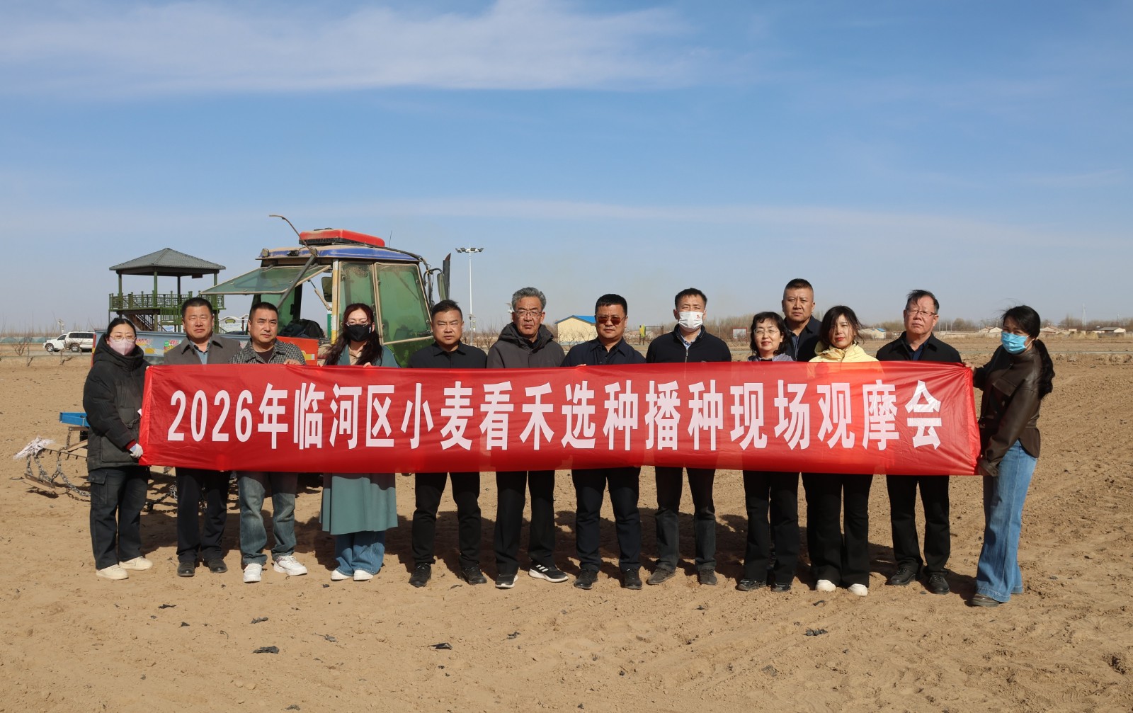 春潮涌动河套,良种助力丰收。近日,2026年市农科所主持的小麦“看禾选种”播种现场观摩会在巴彦淖尔农高区临河农场七分场项目区举行。与会人员走进田间地头,实地查看小麦播种与品种展示情况,共话良种推广与粮食增产新路径。