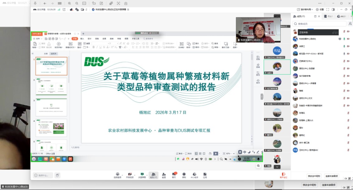 为提升我国品种审查与DUS测试工作的科学性与规范性,推动育种创新,农业农村部科技发展中心于2026年3月17日线上组织召开了“草莓等作物繁殖材料新类型品种审查测试研讨会”。会议由农业农村部科技发展中心高级农艺师杨旭红主持,来自中国农科院、各测试分中心、高校、研究所及代理公司的二十余位专家参会。巴彦淖尔市农牧业科学研究所植物新品种测试中心刘春晖参加了本次会议。会议围绕新兴繁殖材料类型的DUS测试挑战与解决方案进行了深入研讨。